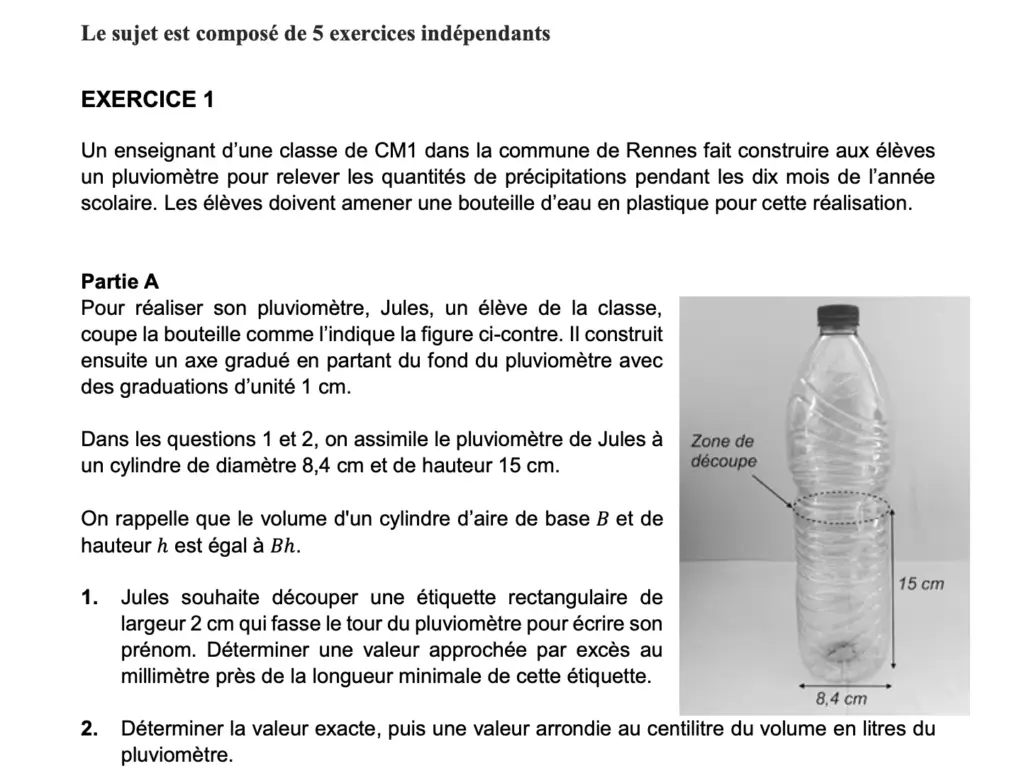 Pour réussir les 2 premières questions de l’exercice 1, il faut savoir calculer le Périmètre d’un cercle et le Volume d’un cylindre (et la formule est rappelée dans l’énoncé). Pour cela, voir nos vidéos sur “Aires et Volumes”, et en particulier notre vidéo d’entraînement sur le calcul du volume d’un cylindre (exactement ce qui est attendu dans cet exercice).