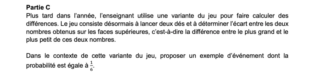 On ne demande pas ici de calculer une probabilité, mais à partir d’une probabilité donnée de donner un événement possible associé… cette question peut retourner un peu le cerveau et peut sembler inhabituelle, attention donc à vraiment se poser tranquillement sur la question avant de rédiger une réponse.